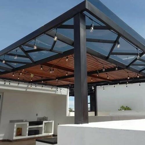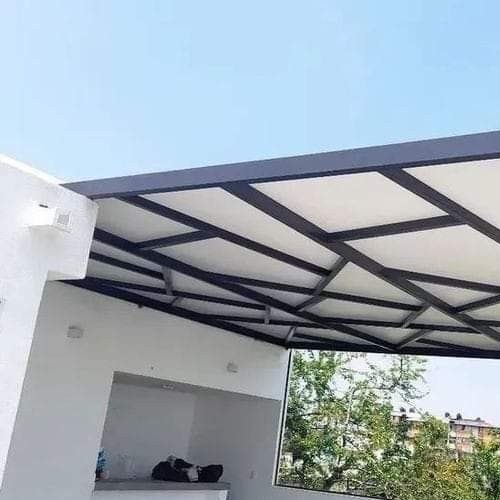 مظلات القماش، PVC، اللكسان، وبديل الخشب للجلسات الخارجية.